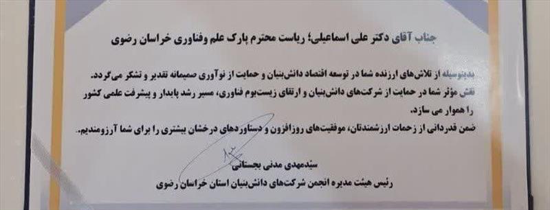 • تقدیر از رئیس پارک علم و فناوری خراسان توسط انجمن شرکت‌های دانش‌بنیان خراسان رضوی