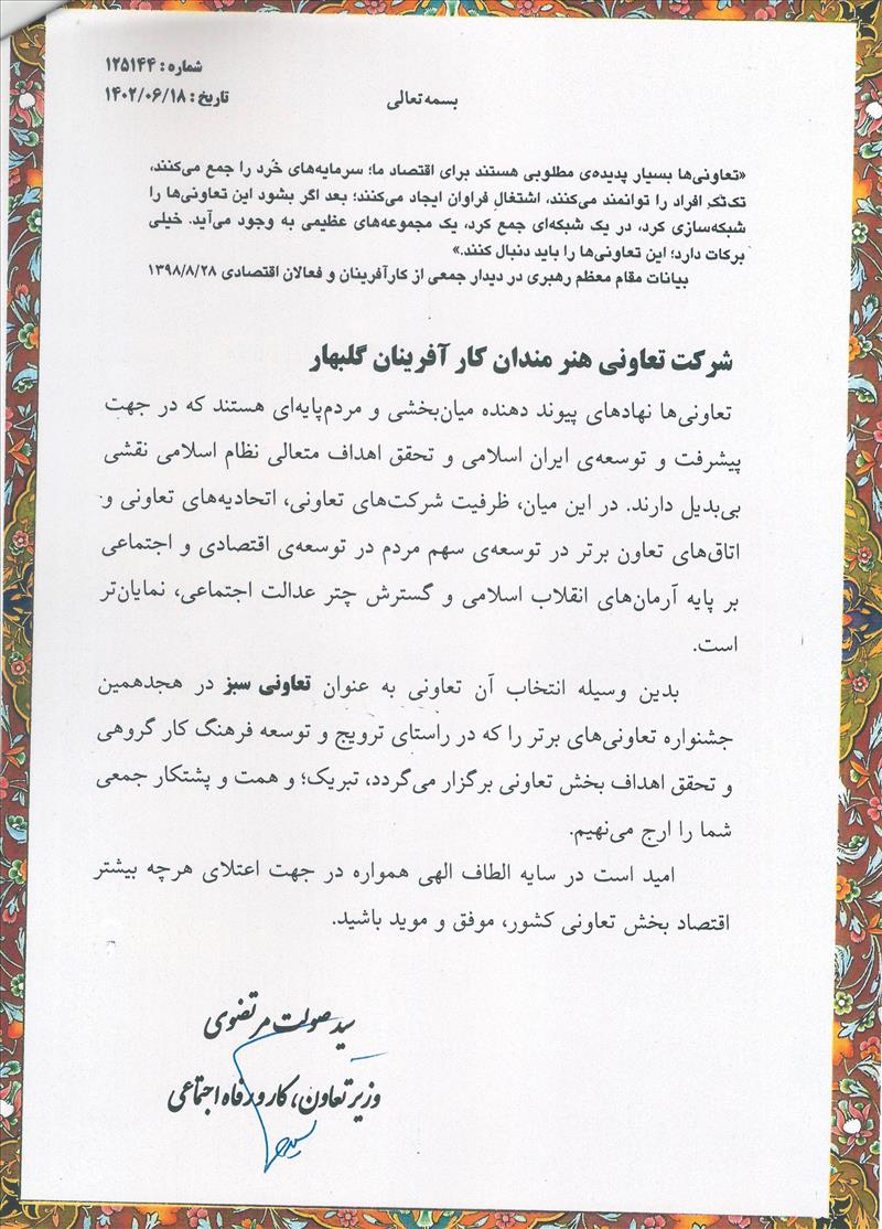 به گزارش روابط عمومی و اموربین‌الملل پارک علم و فناوری خراسان، شرکت تعاونی هنرمندان کار آفرین گلبهار واحد فناور عضو دوره رشد مرکز رشد فناوری‌های فرهنگی و زیارت پارک به عنوان "تعاونی سبز" در هجدهمین جشنواره تعاونی‌های برتر انتخاب شد. در این همایش از 23 تعاونی برتر ملی در همایش تعاون و حکمرانی مردم با حضور رئیس جمهور در سالن همایش‌های صدا و سیما تقدیر شد. این همایش با هدف معرفی بهتر الگو‌های موفق تعاونی و با حضور تعاونگران سراسر کشور، اتاق‌های تعاون استانی، اتحادیه‌های تعاونی، اداره‌های کل استانی و اتاق تعاون ایران برگزار شد.